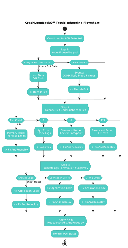 Critical insight: If your pod has reached CrashLoopBackOff status, it means several steps have already succeeded—the image was pulled, the pod was scheduled, and the container started. The failure is happening inside the container’s runtime execution.