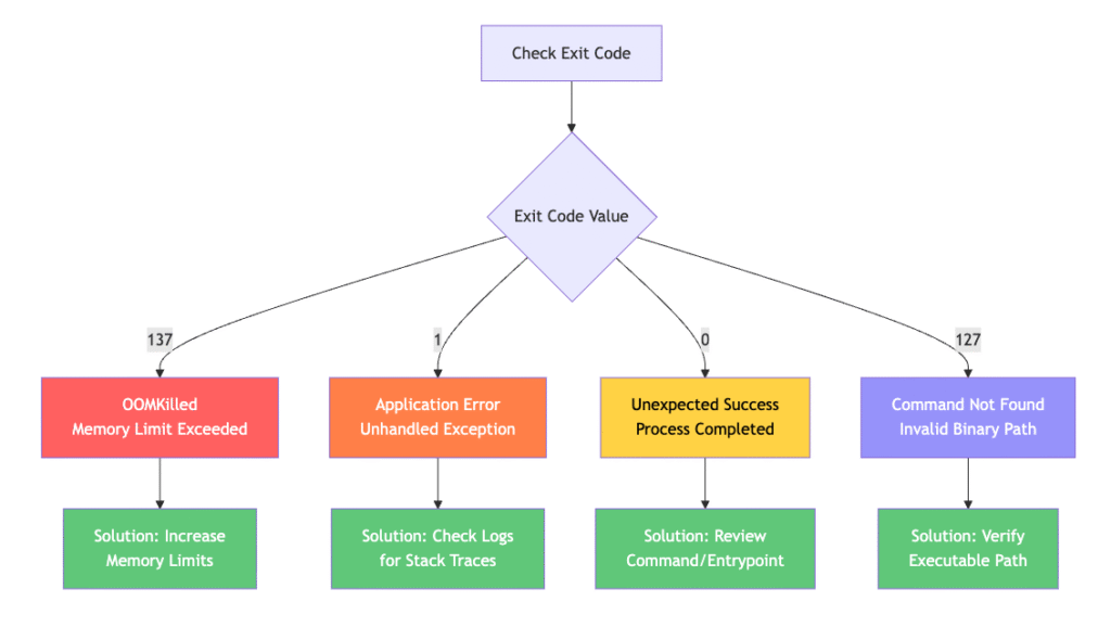 The exit code is your container’s final message to the kubelet. Understanding these codes immediately narrows your investigation scope.